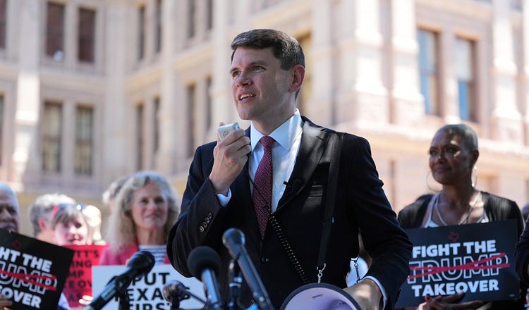 Exodus is apropos because Talarico, 36, is the grandson of a Baptist preacher and works on his Austin Presbyterian Theological Seminary studies when the Texas legislature is out of session. He was in Illinois on Wednesday when I asked him about the Trump-backed redistricting plan, what it means to be a God-loving liberal, and the future of the Democratic Party.