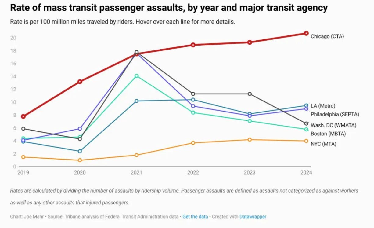 The numbers confirm it: Federal Transit Administration data puts Chicago Transit Authority’s (CTA) passenger assault rate at roughly 20 per 100 million miles traveled in 2024—more than double every other major system in the country.