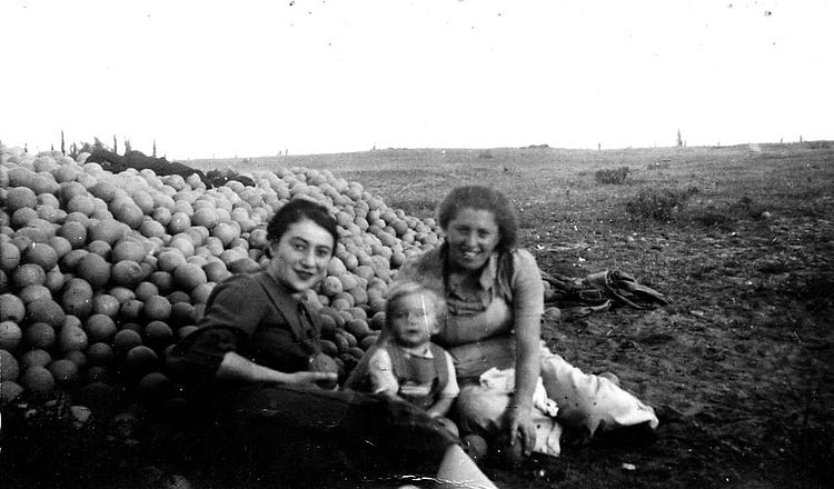 Judea Pearl sits between his mother, Tova (foreground), and his aunt Chana (background in front of their orange harvest in 1939. (Courtesy of author)