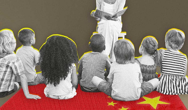 A reading app used in 94 percent of American elementary schools was recently acquired by a Chinese-owned tutoring company. (Illustration by The Free Press; images via Getty)