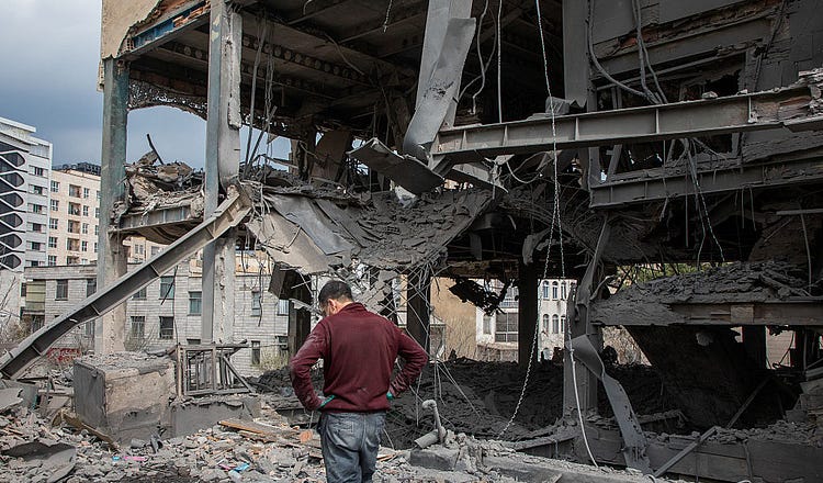 A person surveys damage at the site of a building hit by a U.S.-Israeli strike on a commercial district, on March 29, 2026. in Tehran, Iran. (Majid Saeedi via Getty Images)