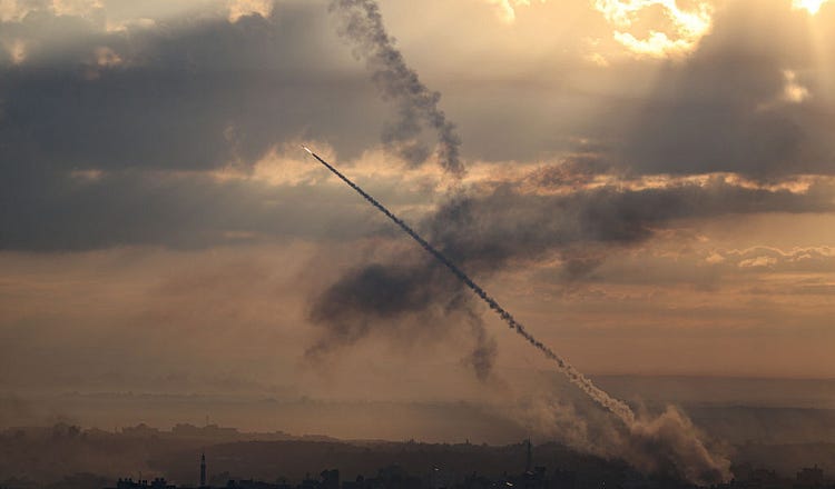 Hamas fires a rocket from Gaza toward Israel on October 7, 2023. (Photo by Mustafa Hassona via Getty Images)