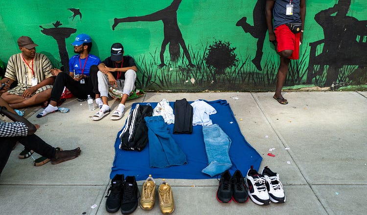 Young men sell clothing outside a migrant shelter in Brooklyn on July 21, 2023. (Photo by Spencer Platt via Getty Images)