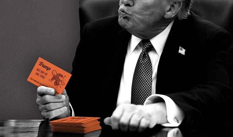 Presidents often issue a flurry of pardons when they leave office. Donald Trump did that on his first day back in the White House, when he granted more than 1,500. (Illustration by The Free Press, photo via Getty)