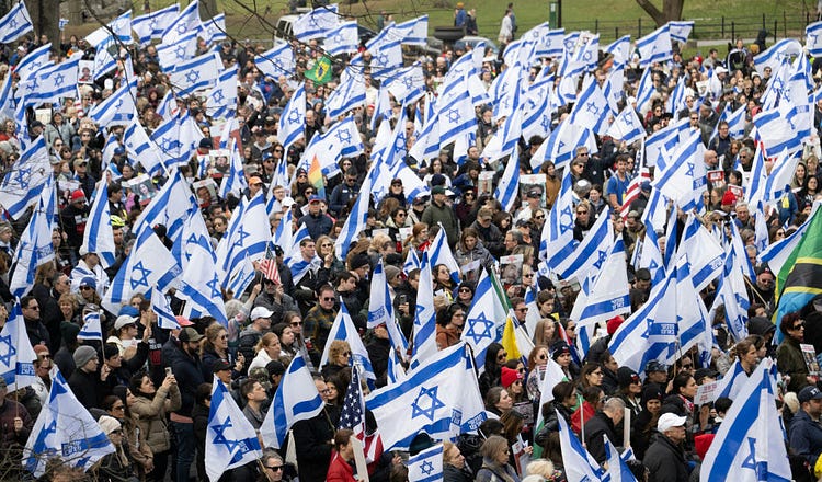Demonstrators hold Israeli flags during a rally in Central Park marking 150 days since hostages were taken in attack on Israel, on March 10, 2024, in New York City. (Noam Galai/Getty Images)