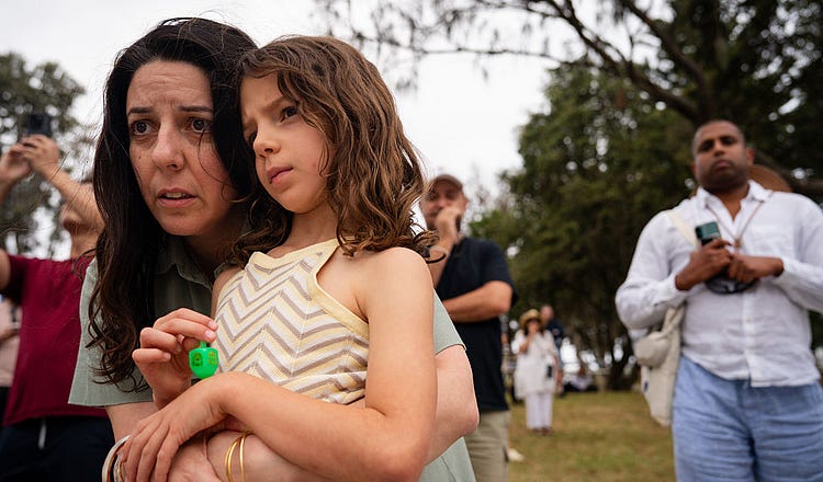 A day after the shooting at Bondi Beach, Nathalie Samia and her daughter, Yasmin Patterson, grieve for Jewish friends in Sydney, Australia, on December 15, 2025. (Audrey Richardson via Getty Images)