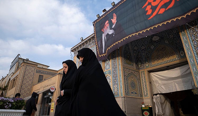 Two worshippers pass beneath a banner of Iran’s late Supreme Leader in Tehran, on March 21, 2026. (Morteza Nikoubazl/NurPhoto via Getty Images)