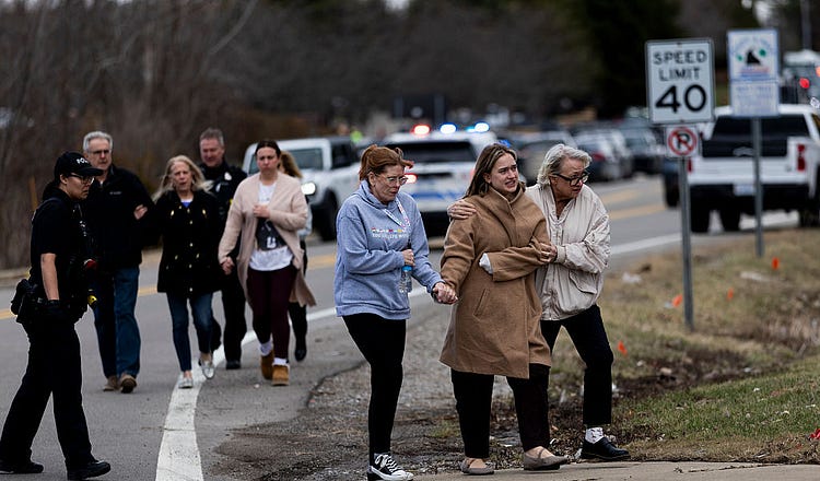 Employees are escorted by law enforcement after a suspect rammed a vehicle near Temple Israel in West Bloomfield, Michigan. (Emily Elconin via Getty Images)