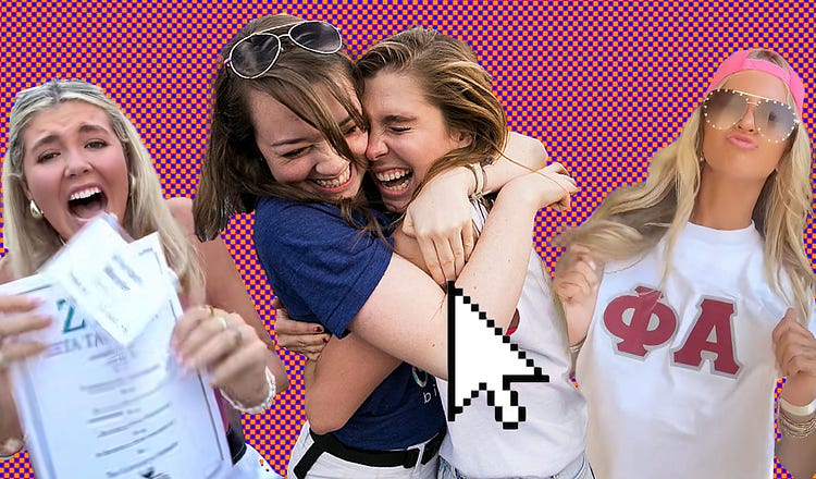 I’ve been having flashbacks this month because videos of rush from across America have been going viral on TikTok; the trend, which has earned the name “RushTok,” is a modern fragmented reality show, told from multiple perspectives. New girls on campus film themselves nervously getting ready to embark on the days’ tight schedules—their eye trained on a specific combination of three Greek letters out on the horizon. The houses themselves put out high-energy agitprop for Delta Delta Delta, or Kappa Kappa Gamma, or whatever. The moms of the freshmen, or Rush Moms, have emerged as bit characters to speak out about the stress it causes them to watch their daughter compete in a social obstacle course.