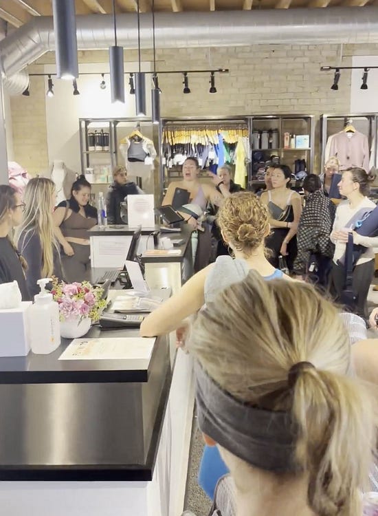 I watch. It opens in a familiar CorePower Yoga studio lobby in Minneapolis. Following claims that anti-ICE signs were taken down by staff, a crowd of women in yoga gear gather around two young workers, hectoring them. A couple of older women are filming, one lobbing questions in sing-song. There is snapping, shouting, and clapping from the crowd. As the employees get flustered, the mob surges in.