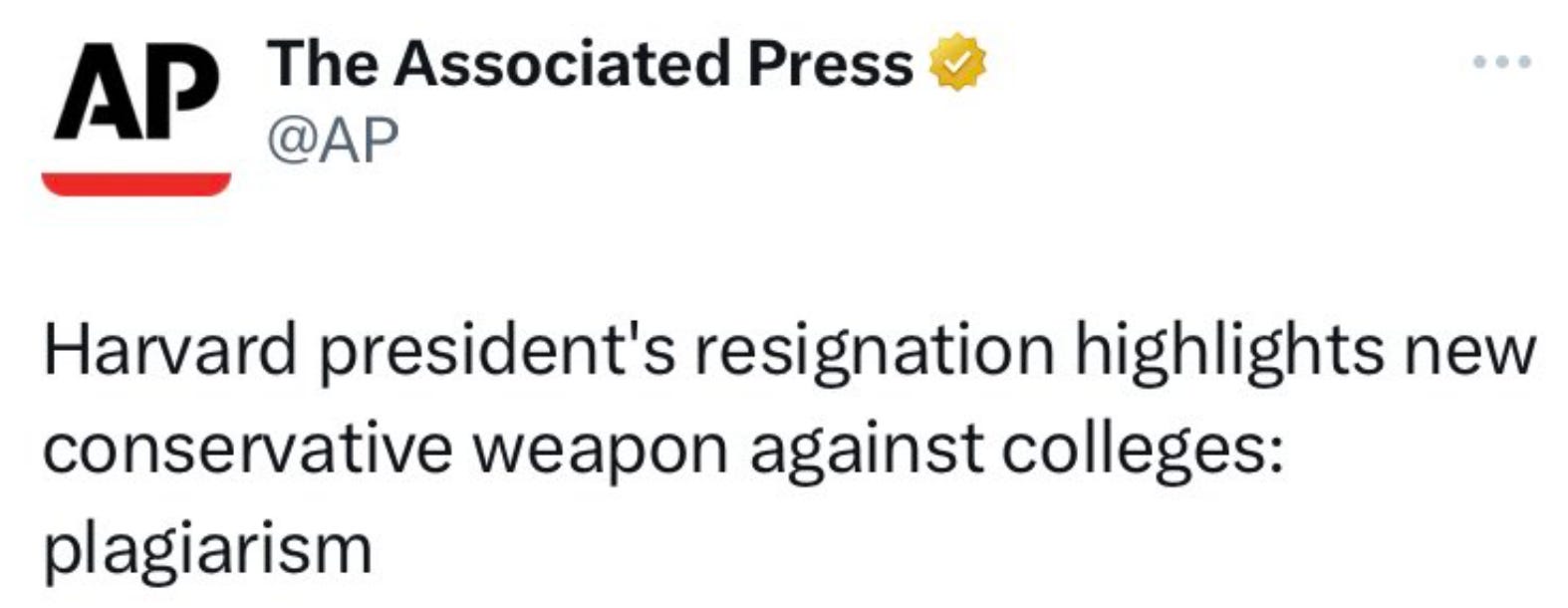 → Claudine Gay is out: There might be other more important news in the world, but in my little corner of heterodox liberalism, this is the biggest news of the decade. Claudine Gay is now the shortest-serving Harvard University president in history. To recap: after hesitating to condemn Hamas freedom fighters after October 7, she then stumbled during a congressional hearing when Rep. Elise Stefanik asked her if calling for the genocide of Jews violated Harvard’s student conduct rules. As The New York Times put it: “she fell into something of a prosecutorial trap”! Ah, it was so clever, the question so complicated. Then someone thought to read her old work, and it turns out she plagiarized dozens of times, quite egregiously (my favorite was plagiarizing someone else’s acknowledgements section). Still, Harvard’s board stood behind her. They had already sicced high-powered lawyers on journalists, threatening to sue The New York Post for reporting on the plagiarism. (Harvard’s lawyers advanced a strange theory to the Post that it was all made up by ChatGPT.) But the drumbeat was too loud. And in what is and will forever be the biggest news of 2024, no matter how many world wars start: Claudine Gay resigned.