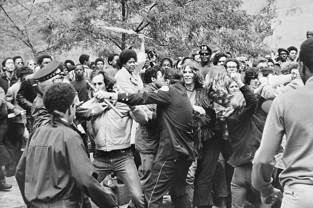 There were the assassinations—of JFK in 1963, MLK and RFK in 1968, and two attempts on Gerald Ford in 1975. There was rioting, culminating in the “long, hot summer” of 1967, which saw over 150 incidents, 83 deaths, and half a billion dollars in property damage within America’s urban ghettos. And there was terrorism, by groups like the Weather Underground, a far-left organization founded by university students, which committed dozens of bombings including of the Pentagon and U.S. Senate.