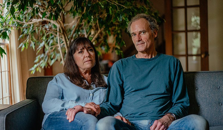 Joe Gow with his wife Carmen Wilson, in their living room in La Crosse, Wisconsin. (Jamie Kelter Davis for The Free Press)