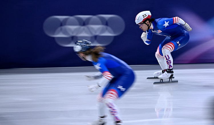 USA’s Brandon Kim and Corinne Stoddard compete in the short track speed skating mixed team relay during the Milano Cortina 2026 Winter Olympic Games. (Wang Zhao/AFP via Getty Images)