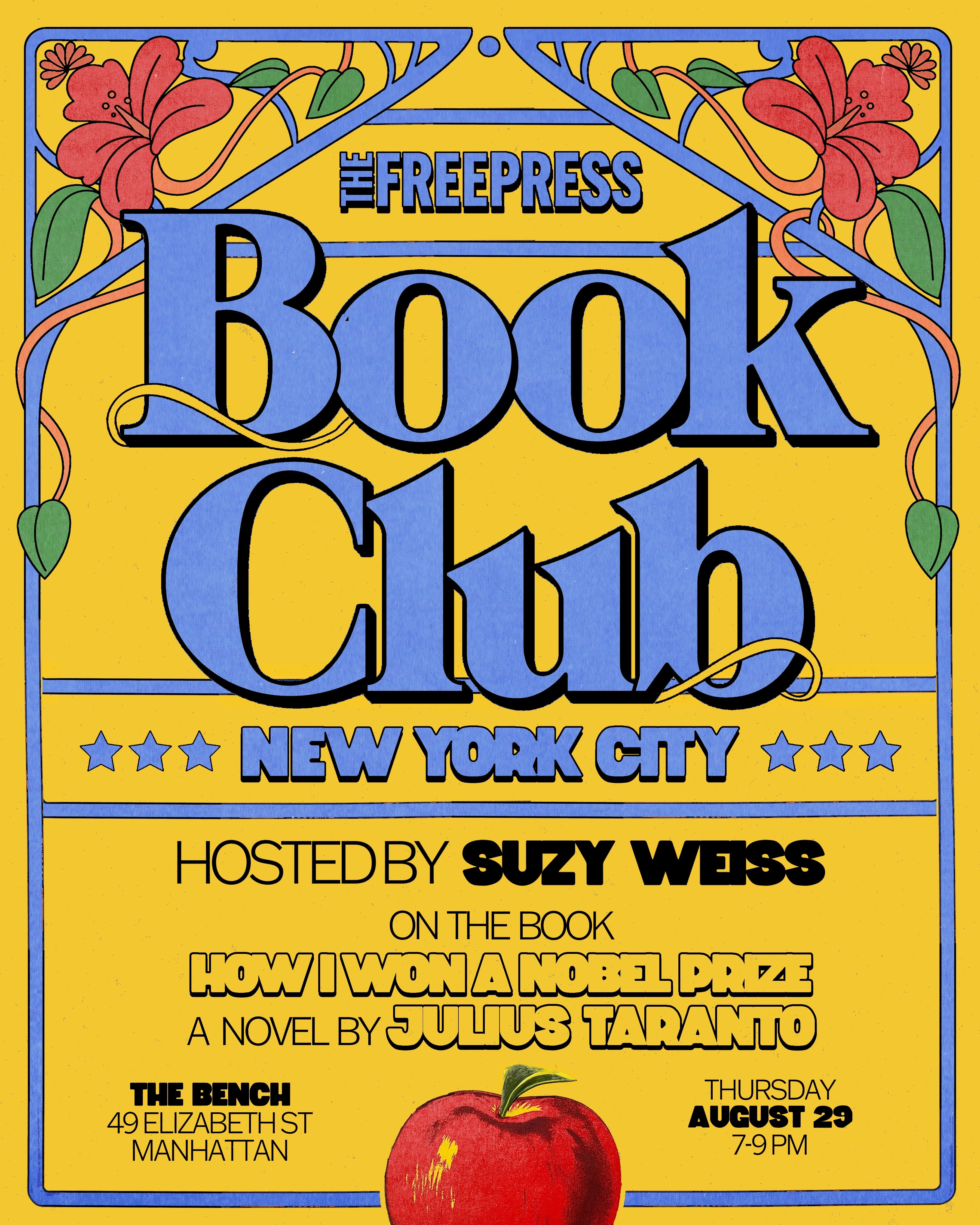 I’ll be talking about How I Won a Nobel Prize with author Julius Taranto on August 29 from 7–9 p.m. at The Bench in downtown Manhattan.