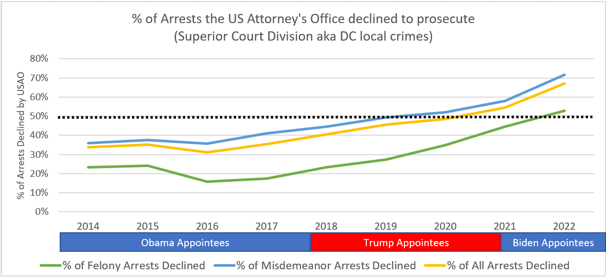 → Abolish prosecution: Abolishing the police was too politically toxic. But abolishing prosecution is quieter and just as effective. Abolishing prosecution is just a nice plan between nice lawyers, who all agreed at Yale that prosecuting crimes is bad. That’s what’s happening in Washington, D.C., where prosecutors are simply choosing not to prosecute at all. Here I’m pulling from a great site called DC Crime Facts.