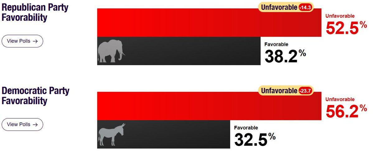 → No one’s popular anymore: I’m not popular, you’re not popular, neither party is popular. The Democrats have been handed Donald Trump—who spends his days shaking people down, flipping off factory workers, spinning meme coins, and embossing things in gold, like citizenships—and they still have no idea how to win over America. It’s a mystery. Democrats are still putting their political capital behind. . . wait for it. . . arguing that there are no biological differences between men and women in sports (Ketanji Brown Jackson putting up the good fight this week! Like a Japanese soldier who doesn’t know the war is over.) Here’s the latest from RealClearPolling: