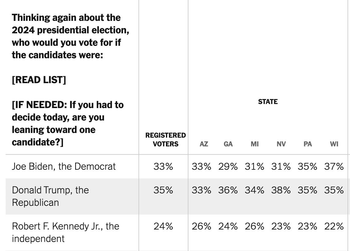 → Battlegrounds go MAGA: In an early poll of battleground states, Donald Trump is beating Biden. I’ve put the raw numbers below, all from a New York Times/Siena poll. The ones I can’t stop looking at: Robert F. Kennedy Jr.