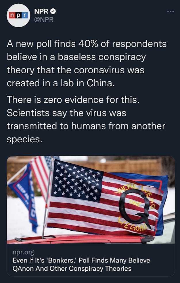 Still, NPR said that anyone who thought the lab leak seemed credible was QAnon, so I guess Vanity Fair has gone full WWG1WGA.