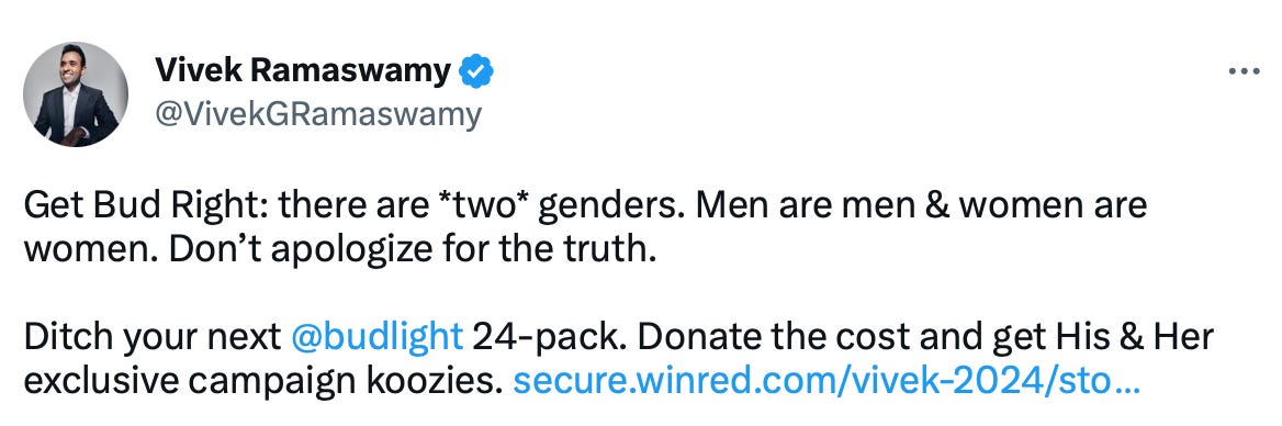 → Republicans laser-focused on the big fights: Budweiser remains the central Republican concern for a second week. For those with happy lives who might have forgotten, Anheuser-Busch made a special Bud Light beer can with trans influencer Dylan Mulvaney’s face on it, sparking outrage from the right. Team DeSantis joined the fun with a new ad that opens with a shirtless, muscular man flexing and the words: “Because woke and beer shouldn’t be in the same brew. . . ” Not to be outdone, Republican presidential contender Vivek Ramaswamy came out with special two-gender beer koozies: