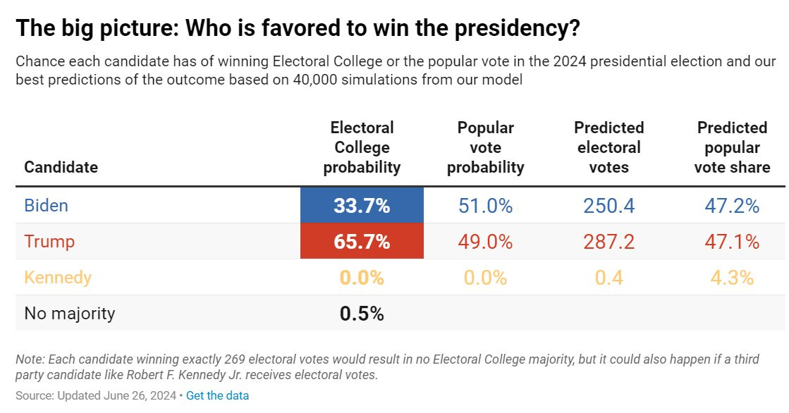 538’s model paints a different picture: of a close race with Biden just ahead. So who is right? The famous pollster, who is now going it alone, or the new management? We’re sitting back, grabbing our popcorn, and focusing on the real battle here: whether an independent journalist or his old media company is going to win. That’s the big 2024 race for me. Okay, maybe the actual race is about to get interesting.