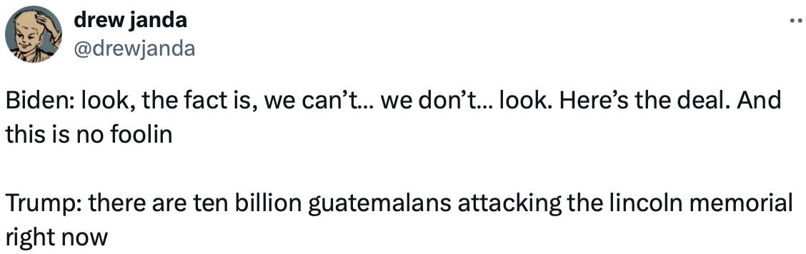 → The debate happened: I don’t know where to begin. In my home we’ve been screaming at the TV for two hours as I write this. Biden walked on stiff, uncomfortable, strange. He held a bewildered expression throughout the night, his mouth slightly open, his eyes wide, staring off into the distance, rarely smiling. I won’t say Trump looked young (he isn’t), but he is less stiff and his eyes blinked normally, jaw firmly in control of mouth. And then they started talking. The extent of Biden’s cognitive decline is undeniable and, speaking as a citizen who wishes my president the best, devastating. For a strange moment as the debate went on, the entire media commentariat was in agreement: this is a disaster for Joe Biden, and the Democrats need to replace him.