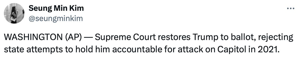 → Trump back on the ballot: In a unanimous decision, the Supreme Court put Trump back on the Colorado ballot. How did anyone ever think kicking the Republican candidate for president off the ballot would work? These state judges just decided to do one-party rule and thought no one would complain? I promise Trump can be beaten at the ballot box—you don’t need to go full Russia to do it. The Associated Press covered it as the Supreme Court endorsing January 6, because of course: