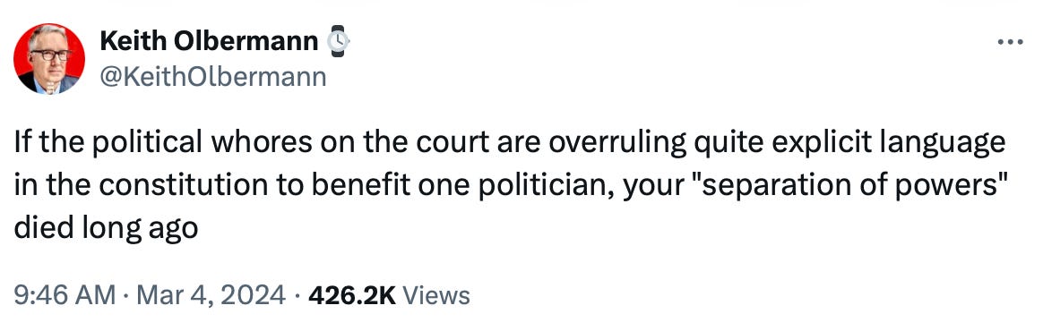 And political commentator Keith Olbermann, a major hero of the #Resistance, wrote that the Supreme Court “must be dissolved.” And then:
