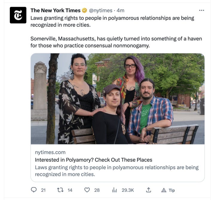 → Polygamy is coming back! In unrelated news (I will NOT make a Mormon joke, I love Mormons) . . . polygamy is back. People are fighting for their right to have many wives, but with a twist: it’s hipster! It’s called a “polyamorous relationship” (I’ve been in one! In college!) and want laws protecting it (I didn’t like it). You see, it’s not like those Christian bumpkins with lots of wives; now there are many wives but they all get latté art every morning so it’s cool. Plural marriage hits a little different if there’s a fiddle leaf fig in the room.