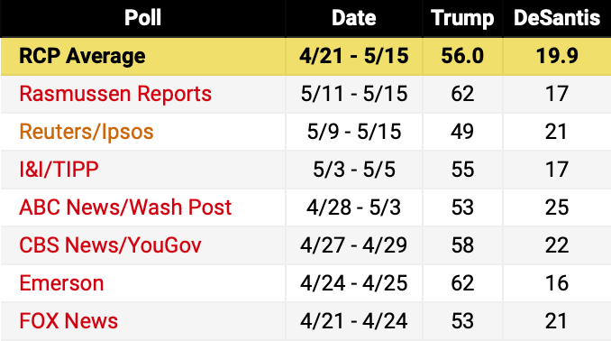 → The polls are back: The prospect of an actual election between Biden and Trump or Biden and DeSantis looks fairly even, with it basically at a tie. But in the Republican primary, it’s not so even: