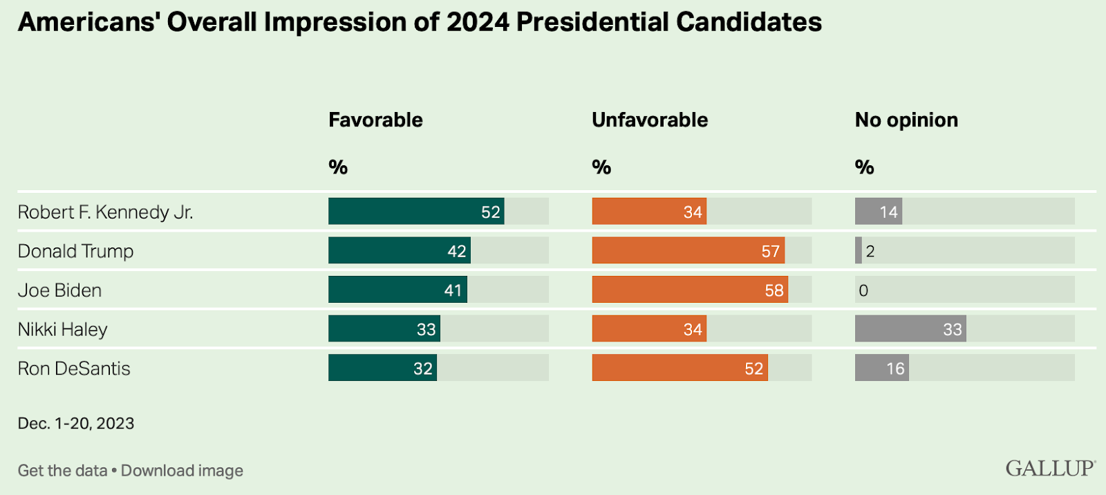 → RFK Jr. instead? Okay, fine: Biden and Trump are neck-and-neck in being really widely disliked, per the latest Gallup polling. The only person Americans like right now is RFK Jr., and at this point I’ve been broken down long enough to say sure, why not. We’ve tried stranger things. Maybe he’s right and I should have just gotten chicken pox like a real man. And my Jewish family did seem less nervous about Covid. In terms of funny news items and odd White House visitors—ten bucks on a plant medicine shaman within the first 100 days—an RFK Jr. presidency would keep TGIF rich, and as such we cannot stand against the American people and their consistently irreverent taste here.