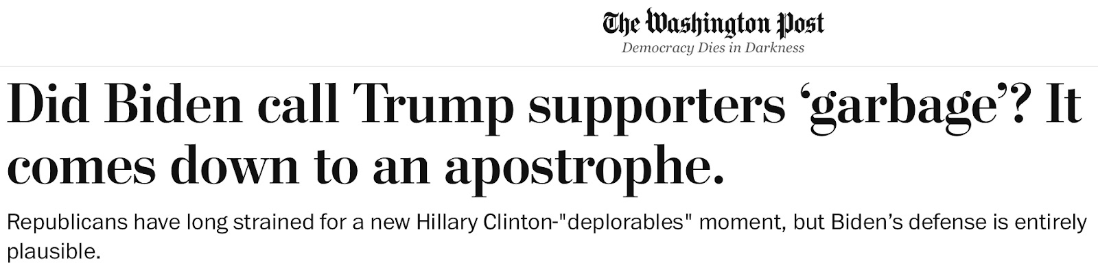Right on cue, America’s reporters snapped into action to deny that Biden said exactly what Biden said. He didn’t mean Trump supporters were trash, he meant that they litter, said The Washington Post.