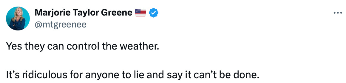 Anyway, let’s say they do control the weather. Don’t they love Biden? So what’s the incentive here for making the hurricane? Marjorie, stop throwing garlic at me—I just want to understand!