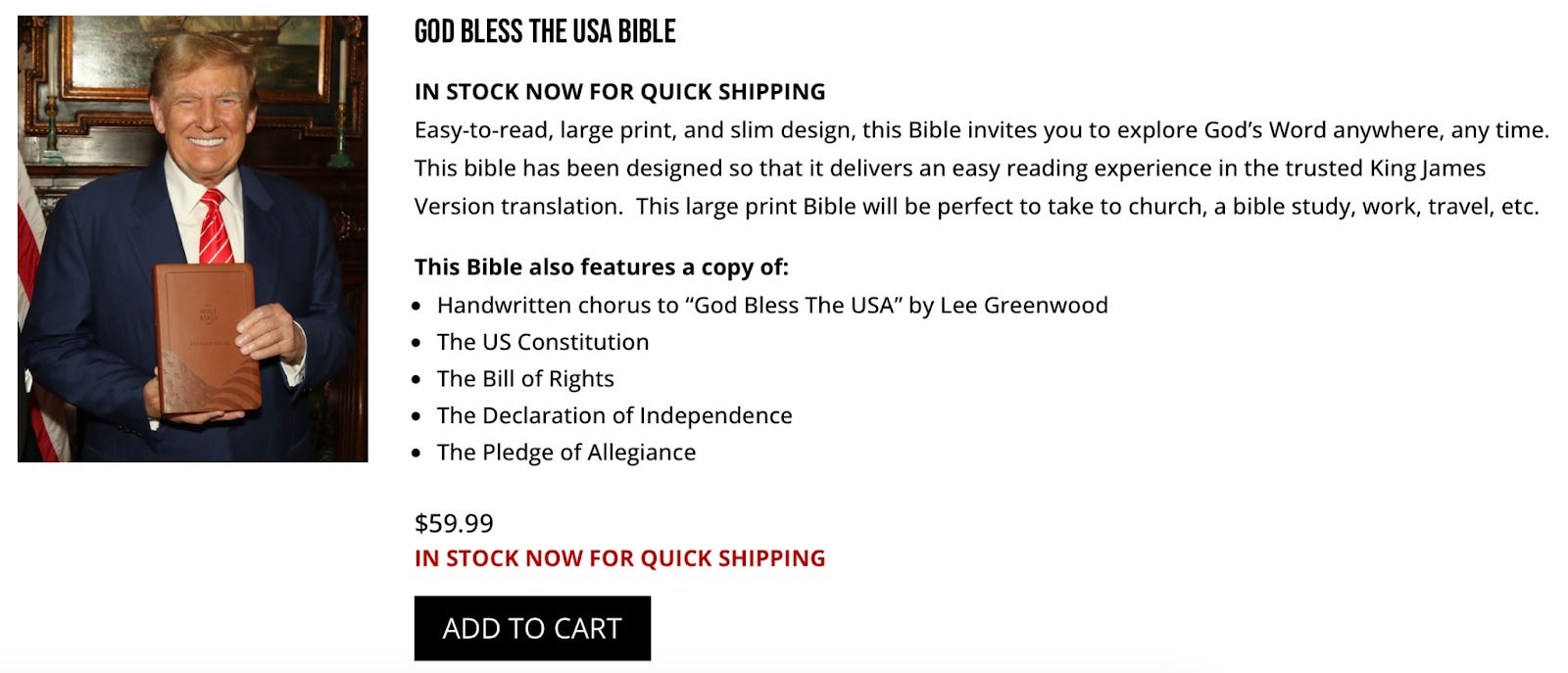 You can also order a more elite Bible such as one “embossed in remembrance of the day that God intervened during President Donald J. Trump’s assassination attempt.” Which, having studied his head tilt, I’m going to agree that God may have played a role, but I think it’s more like the Old Testament one. Only Jewish God would have the bullet clip his ear to make a point, I’m guessing, about not mixing linen and flax fabrics on the Sabbath. He works in mysterious ways.