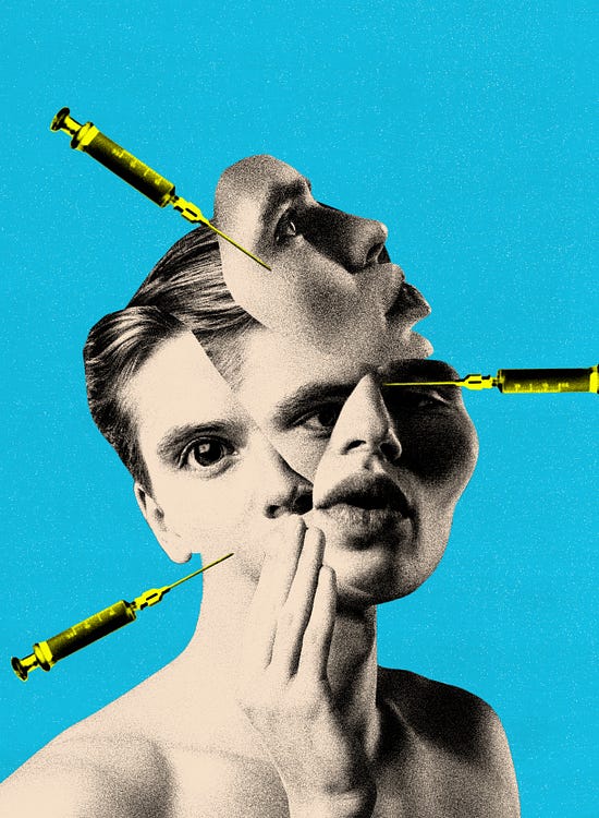 A few years later, he started “bone smashing”—another technique he’d learned online, which involved hitting himself in the face with a hammer, one minute in each place every day, in an effort to create microfractures in his jawline and cheekbones. The bones were supposed to get bigger as they healed, giving him a more chiseled look.