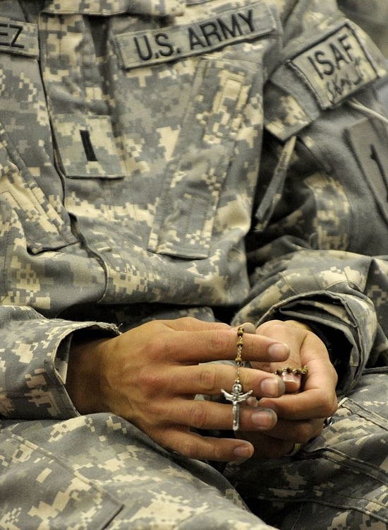 The Church is not pacifist in her doctrine. Waging just war is a last resort to protect the innocent by defeating the enemy. It is a virtuous act to take up arms in defense of the nation against an unjust aggressor.