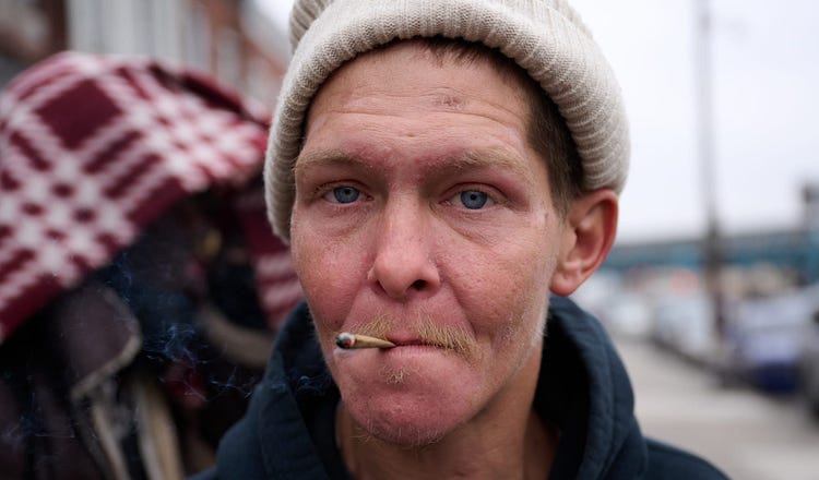 A man named Sean stops on Kensington Avenue in Philadelphia, where medetomidine is being added to fentanyl. (Courtesy of The Dispatch, Photography by Vincent Guglielmo)
