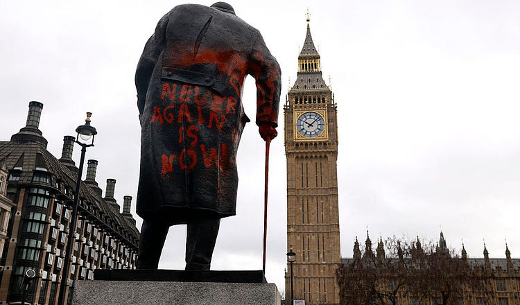 Step out of the Foreign Office—now inelegantly renamed the Foreign, Commonwealth, and Development Office—and almost directly in front of you is the Cenotaph, Britain’s stone memorial to its war dead. Walk north past a gallery of bronze sentinels, including Field Marshal Douglas Haig and Montgomery of Alamein, and before long Trafalgar Square opens before you, Admiral Nelson standing on his column high above it. Go south instead and the road widens into Parliament Square, where, ringed by yet more monuments to Britain’s political and imperial past, stands a brooding old bald man, hunched in his heavy coat and leaning on a stick.