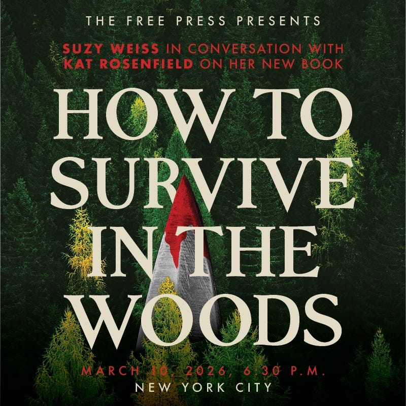 You all know Free Press columnist Kat Rosenfield as a sharp observer of modern culture—one who writes essays about everything from our narratives about immigration to the glory of free speech, and that’s just in the last week. But she has another life: as a writer of thrillers. Her next novel, How to Survive in the Woods, has the office absolutely gripped. It’s a twisty tale of an ex-girlboss with a dark secret and a controlling husband she’s desperate to be rid of, set in the shadowy forests of northern Maine. The novel is out March 10 (but you can preorder today!), and that evening, Kat will be in conversation with Suzy Weiss in New York. It’s going to be a very fun evening with two Weekend Press greats—and tickets are selling fast, so get yours today.