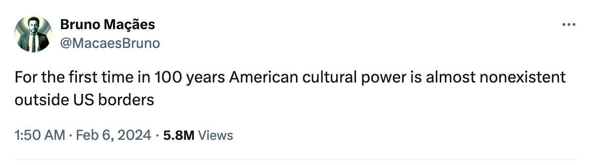 I don’t want to address here the moral issues around U.S. foreign policy, or even the question of exactly how dominant the U.S. is on the political stage, but I can tell you for a fact that the notion that the U.S. no longer has cultural power is so absolutely wrong it’s laughable.