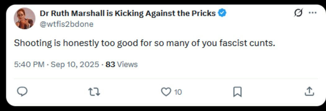 Ruth Marshall, an associate professor of religious studies and political science at the University of Toronto—one of Canada’s leading universities—posted this on X: “Shooting is honestly too good for so many of you fascist cunts.”