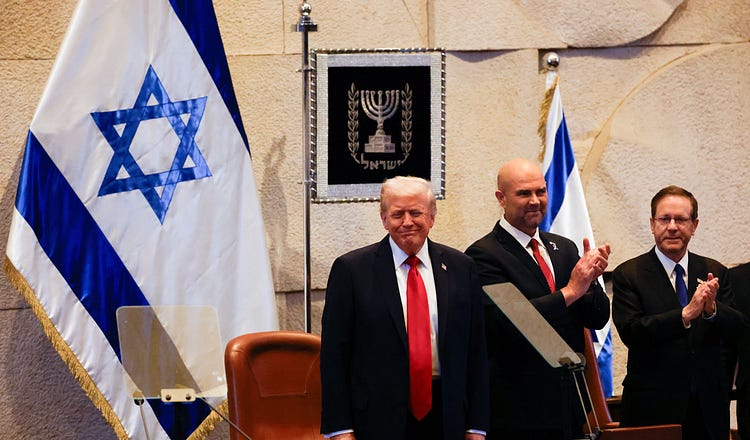 President Donald Trump’s triumphal address to the Israeli Knesset Monday had it all: solemn vows, idealistic visions, boasts of strength, rambling digressions, and sarcastic humor. Not to mention a surprise twist, when Trump called on Israeli president Isaac Herzog to end Prime Minister Benjamin Netanyahu’s criminal trial by pardoning him. Trump said the appeal wasn’t in his prepared text. “But I happen to like this gentleman over here,” Trump explained, “and it just seems to make so much sense.”