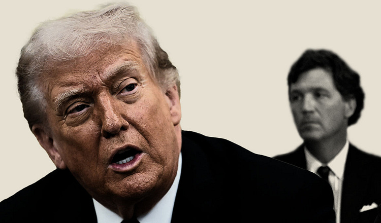 The Iran war has exacerbated tensions between President Trump and Tucker Carlson, writes Eli Lake. (Illustration by The Free Press; images via Getty)