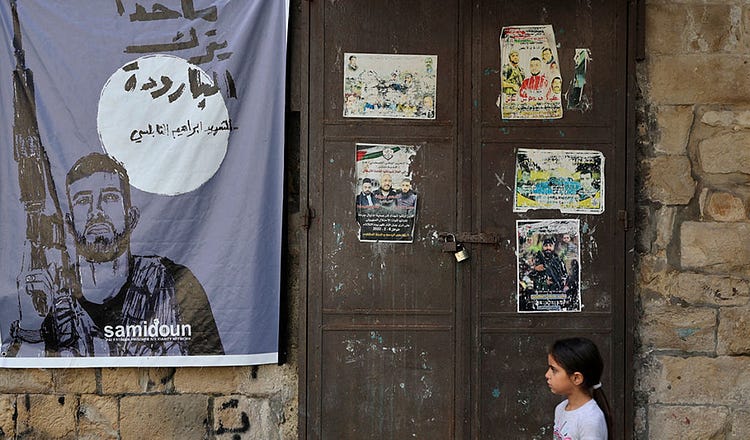 A Palestinian girl stands near a poster of the Al-Aqsa Martyrs’ Brigade Commander Ibrahim al-Nabulsi, who Israeli troops killed in August. Samidoun, which the U.S. and Canada designated as a terrorist group on Tuesday, claims to be an NGO advocating on behalf of Palestinian prisoners in Israel. (Jaafar Ashtiyeh via Getty Images)
