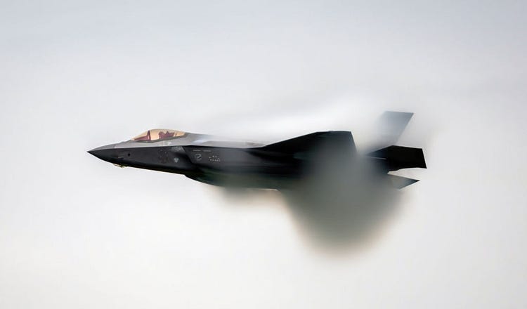 A USAF F-35 fighter jet breaks the sound barrier. “If we ever had to fight World War III, the U.S. wouldn’t be ready,” Elliot Ackerman writes for The Free Press. (Andrej Tarfila via Getty Images)