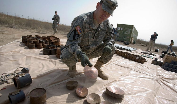 A U.S. Army soldier in Iraq examines weapons with markings indicating Iranian manufacture. (Photo by Robert Nickelsberg via Getty Images)