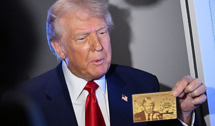 Donald Trump holds the $5 million Gold Card on board Air Force One, en route to Miami, Florida, on April 3, 2025. (Mandel Ngan/AFP via Getty Images)