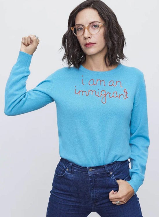 These are the kinds of messages that luxury sweater brand Lingua Franca sells to a certain upper-class, mostly female, millennial demographic, for north of a few hundred dollars, plus shipping and handling. The cashmere sweaters are especially popular among a certain type of Manhattanite or Angeleno. Oprah Winfrey has worn one. So has Tom Hanks, Tina Fey, Meryl Streep, and Martha Stewart.